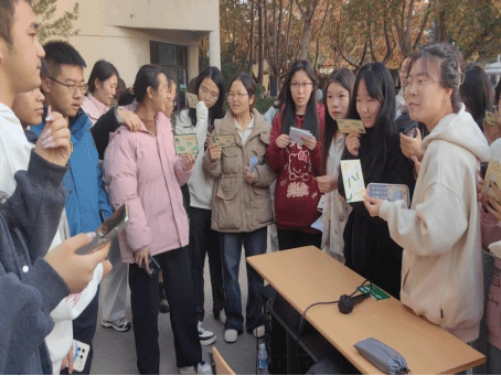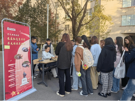 活动前期,马克思主义研习社精心规划五大功能区域,领卡兑奖区设于主楼门口,红色故事站、红色歌曲站、红色诗词站、红色家书站分别坐落于鸽子岛、太行广场、档案馆门口及思政广场,形成覆盖校园核心区域的红色文化体验矩阵。活动伊始,同学们有序领取集章卡,正式开启这场“行走的思政课”。